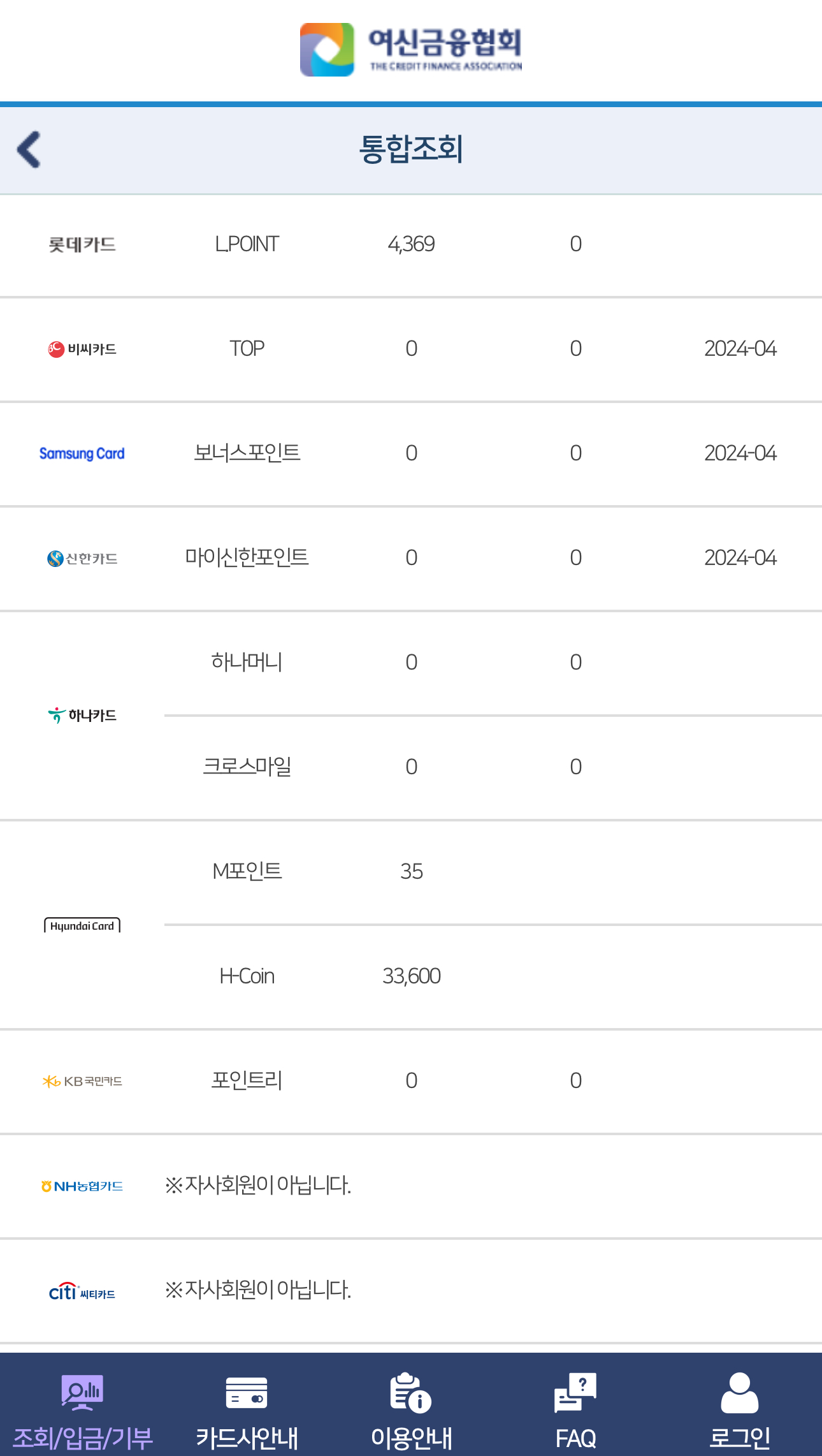 저는 카드포인트 통합조회 창을 누르고 조회하였지만